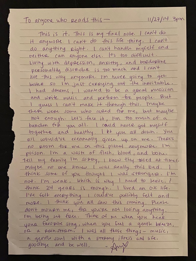 I don’t know what I’m saying anymore. My mind went to that night and spiraled. I wish I could appear before that 24 year old Amy and grab all those pill bottles and run away with them. I wish I could’ve saved her from years of misery. Because now that Amy still lives in me and is still wishing to die and keeps reliving it, over and over. She keeps reminding me of how he left that day and didn’t come back until later, then went to bed even thought I was unconscious. She keeps telling me that he didn’t care enough if I lived or died. And I’m fighting her because she thinks nobody will love me enough to care if I live or die. If I died, nobody would know until it was too late.